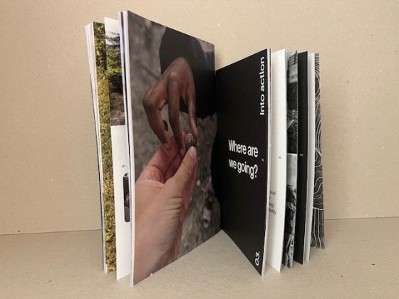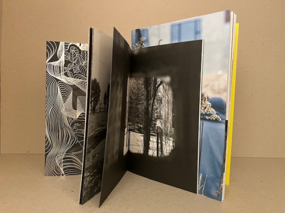 afwerking: binnenwerk genaaid gebrocheerd met zwart gekleurd garen en ‘blote’ afgelijmde rug (koudlijm) , binnenwerk geplakt op pagina 3 van het omslag, het deel dat aan de bovenzijde uitsteekt is niet genaaid de boekjes zijn aan de onderzijde uitgelijnd